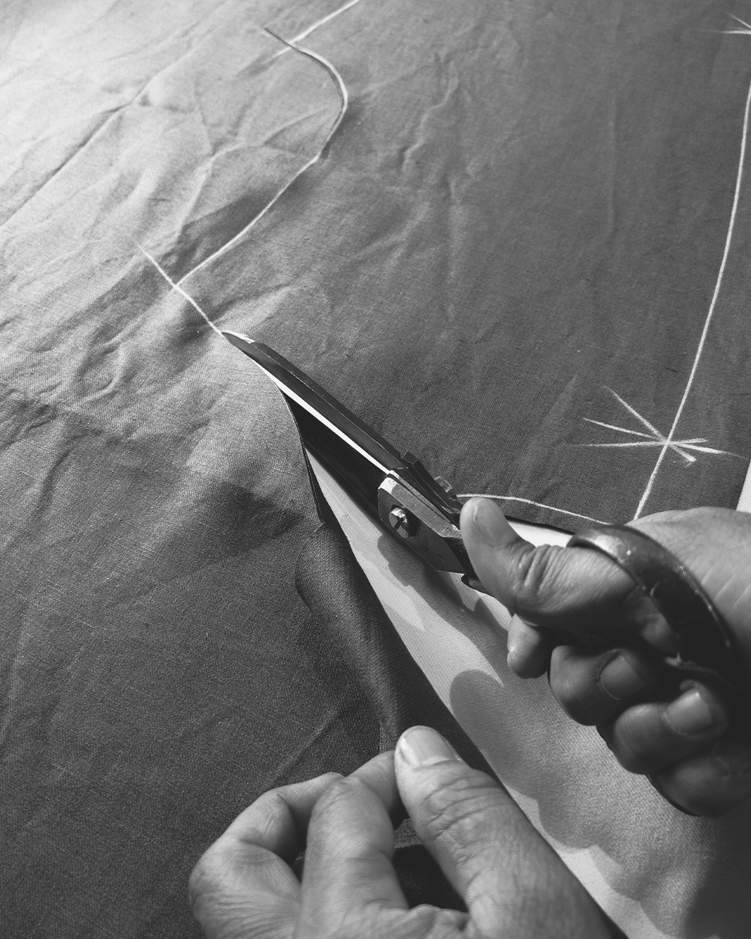 The chosen cloth laid out and cut by hand. Aligned carefully to grain and nap, patterns matched where required. Structural points marked clearly. Allowances kept at selected seams for future alterations.