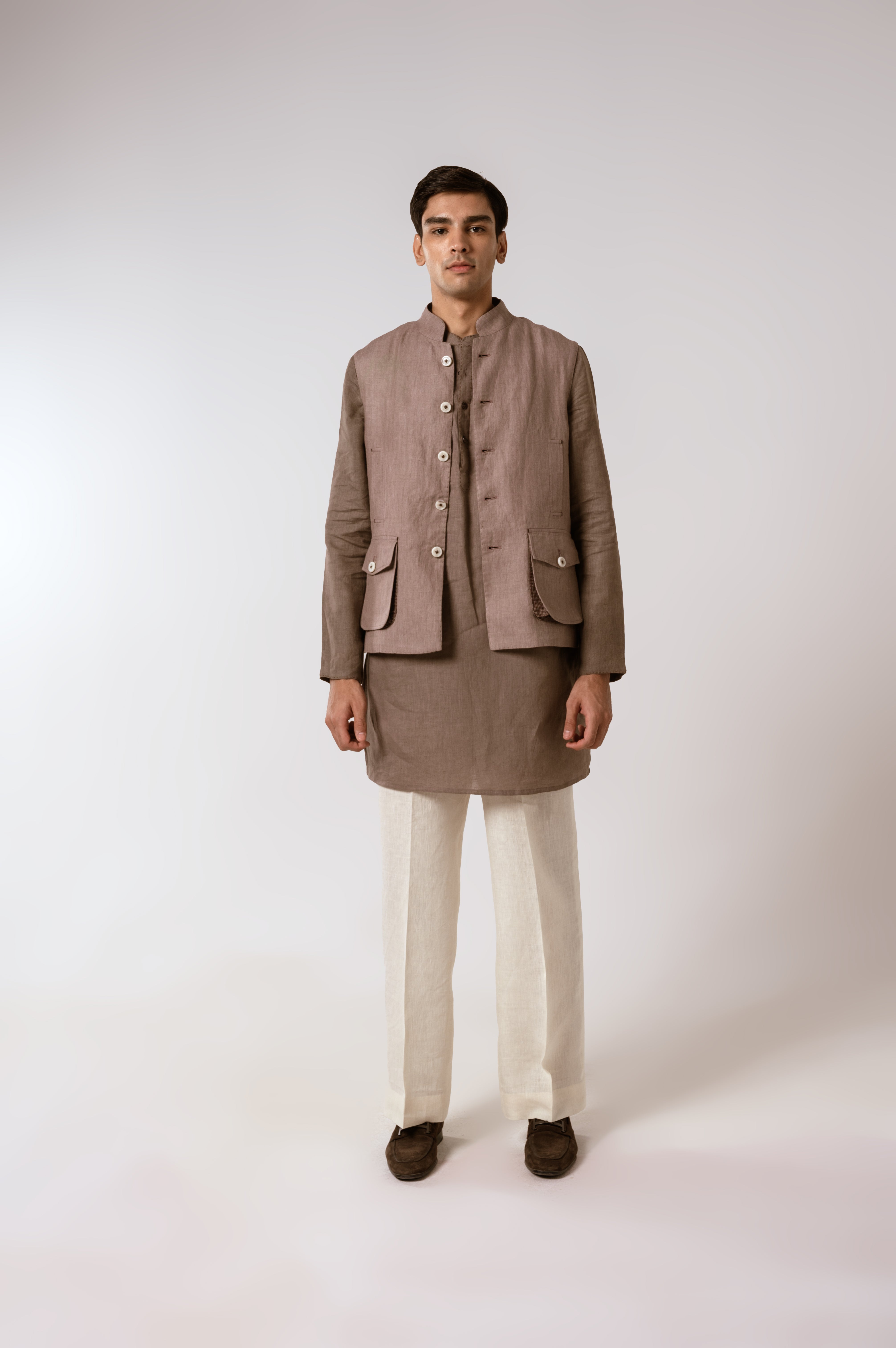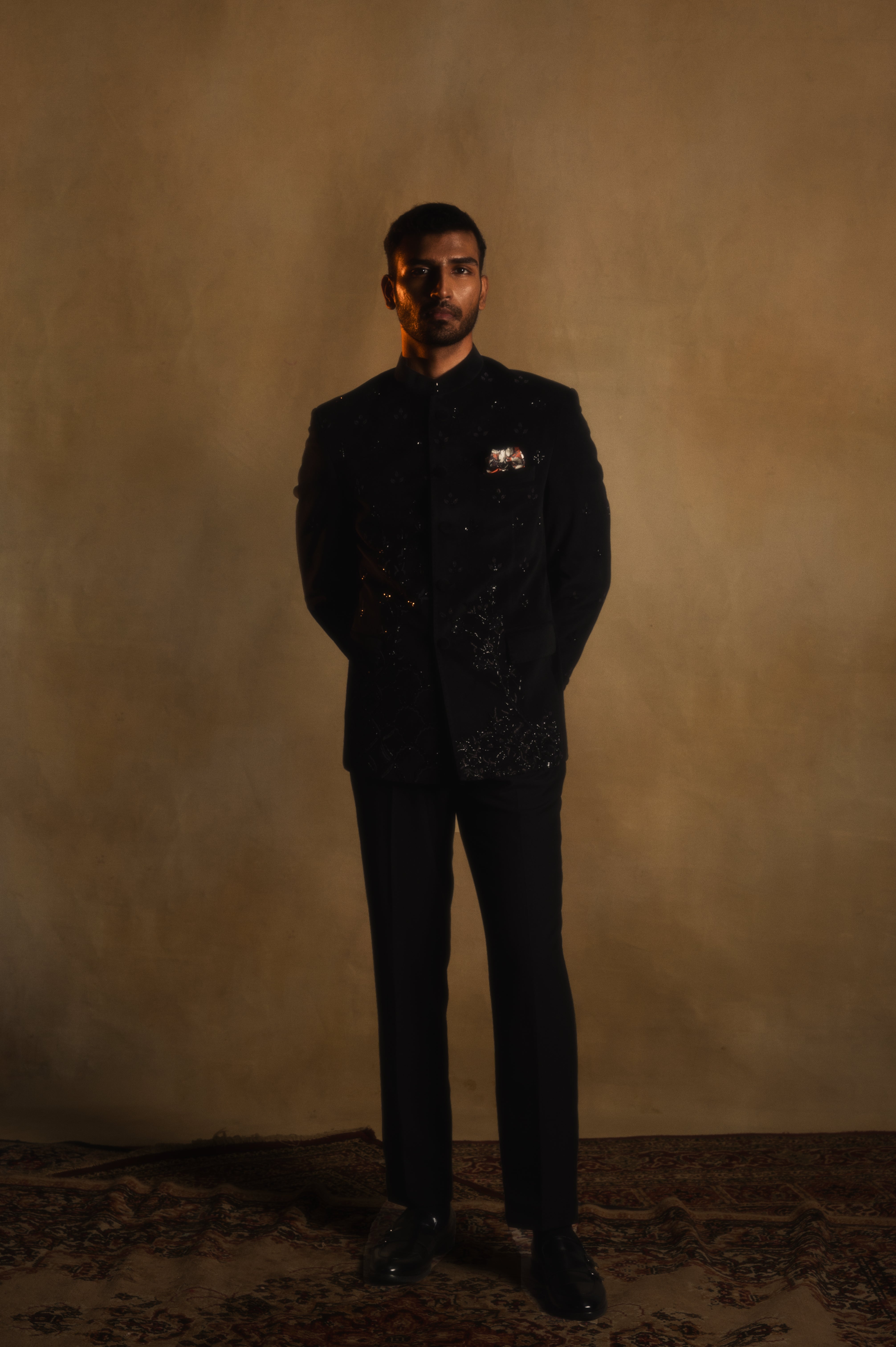 Our interpretation begins with that foundation. The collar cut to sit neatly and upright at the neck, the body drafted with care through the chest and waist. Particular attention given to the vertical line that defines the Bandhgala, allowing it to hold its structure.