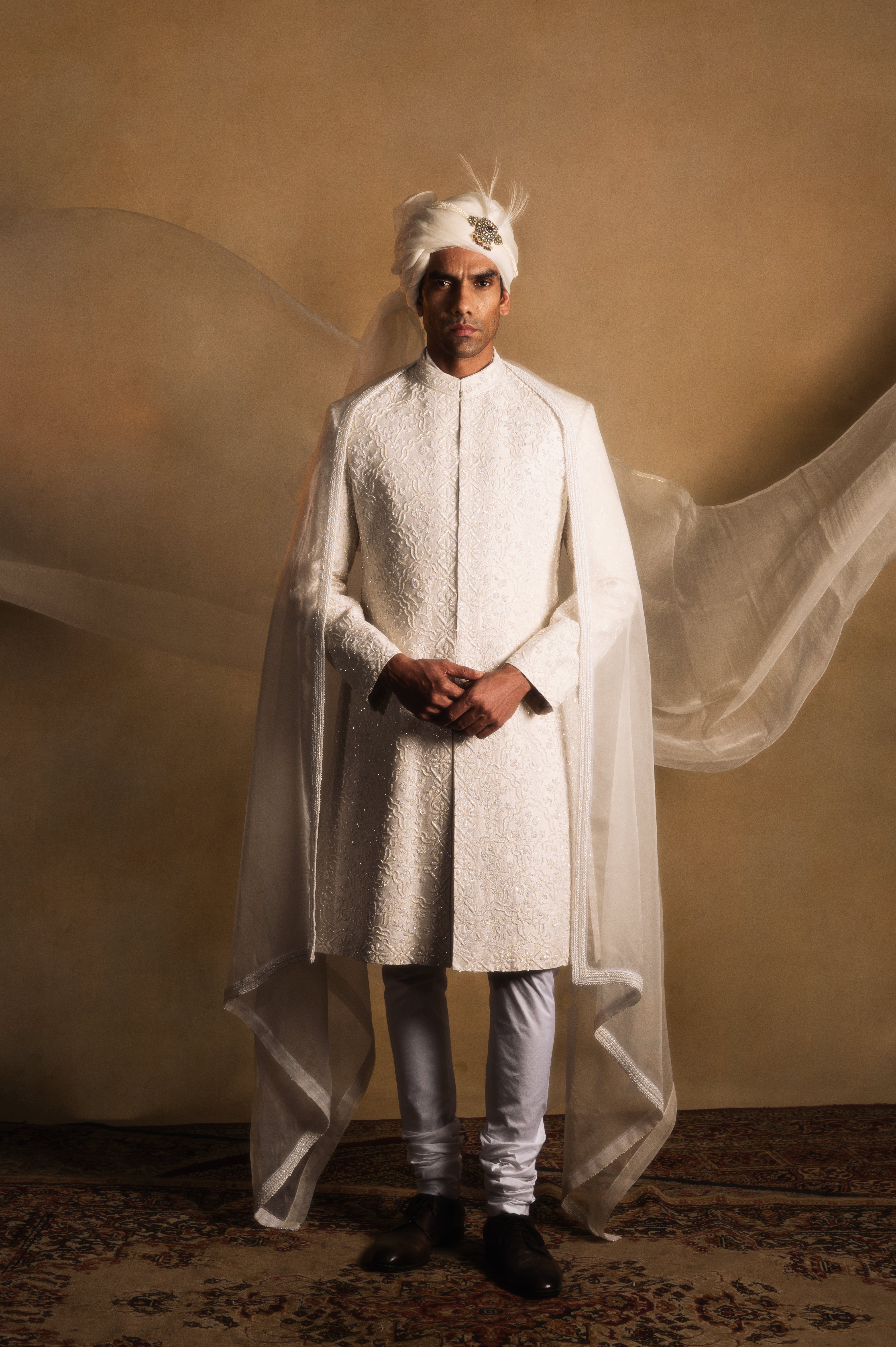 Our Achkan is informed by a tailoring lineage in Mahmudabad where this silhouette has been made consistently for generations. What drew us to it was the clarity of its proportion, the way it stands upright, the measured length, the uninterrupted front.