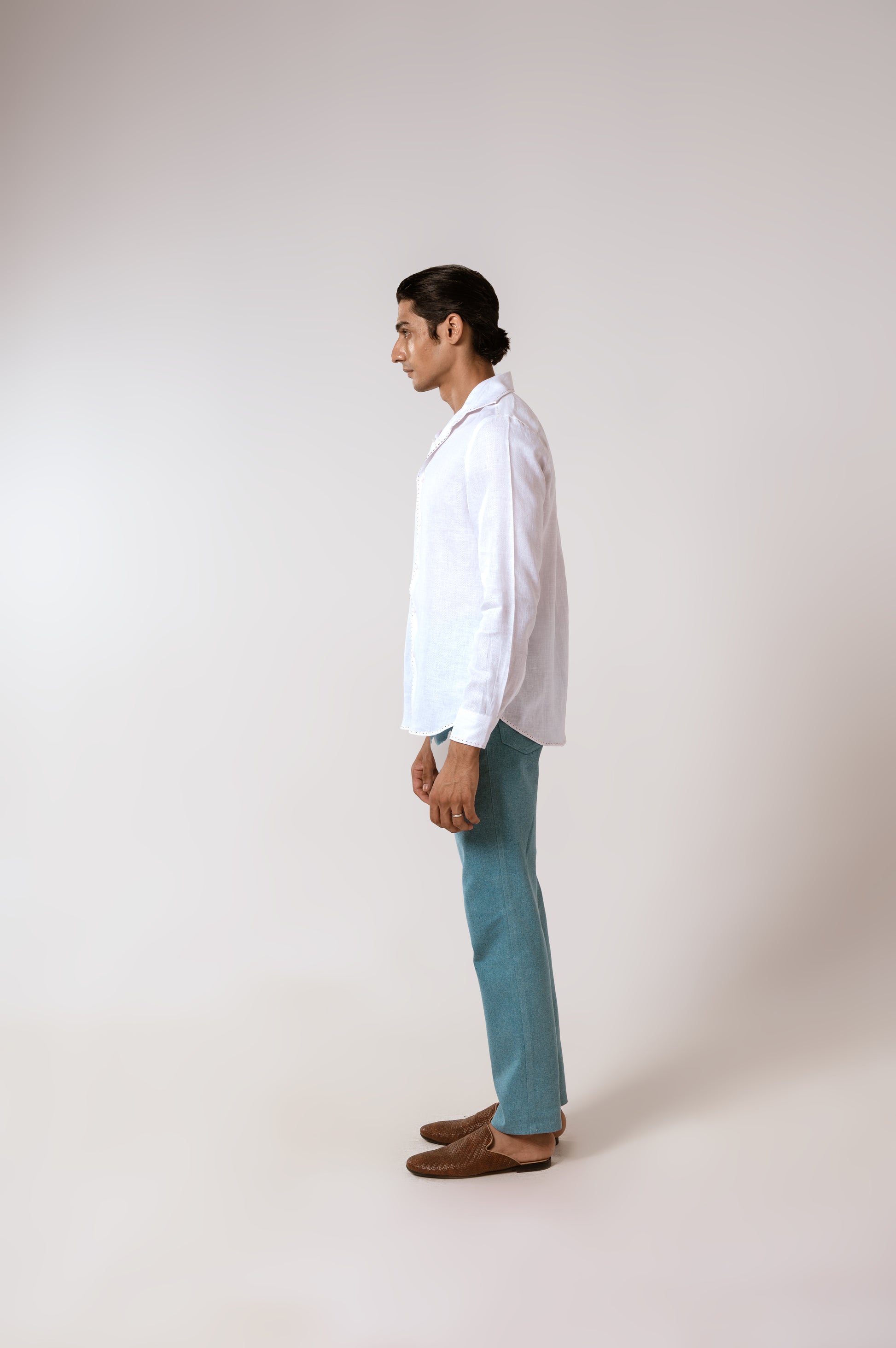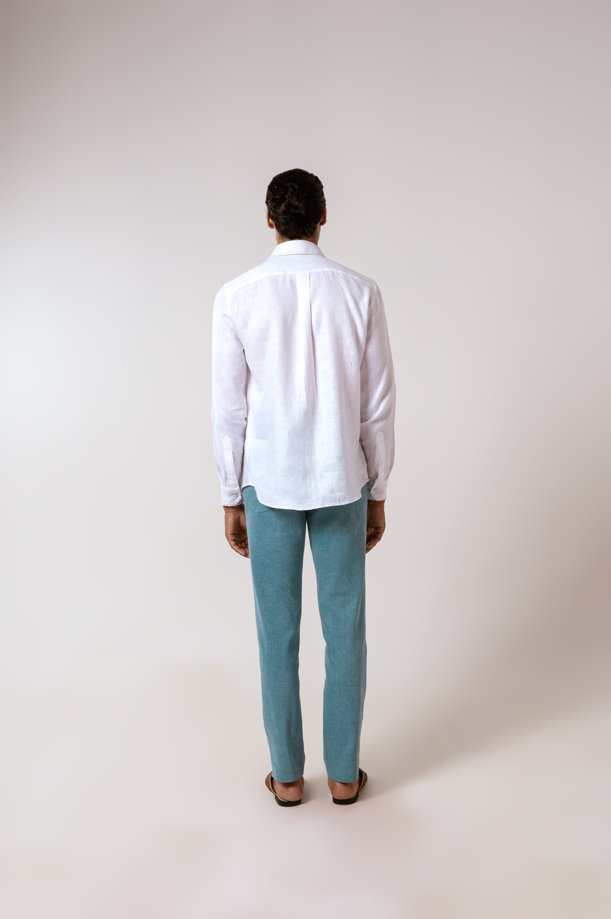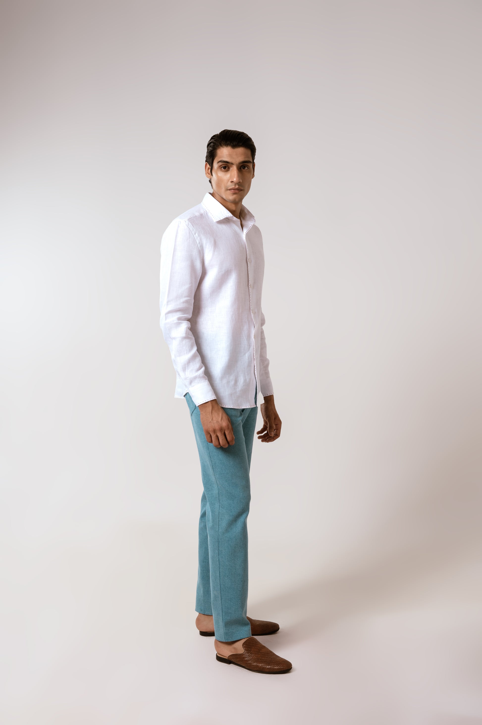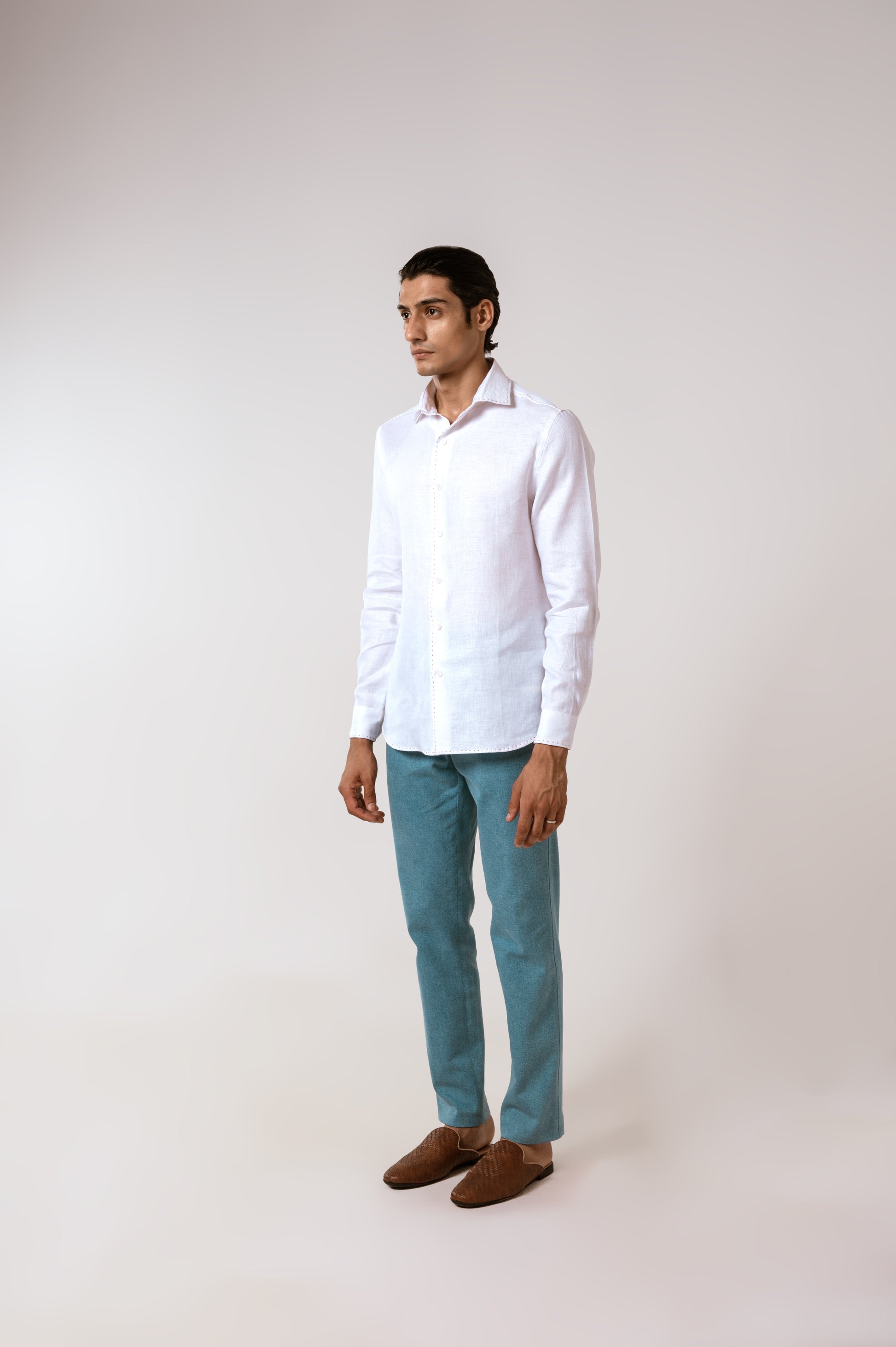 White Linen Shirt with Herringbone Pattern