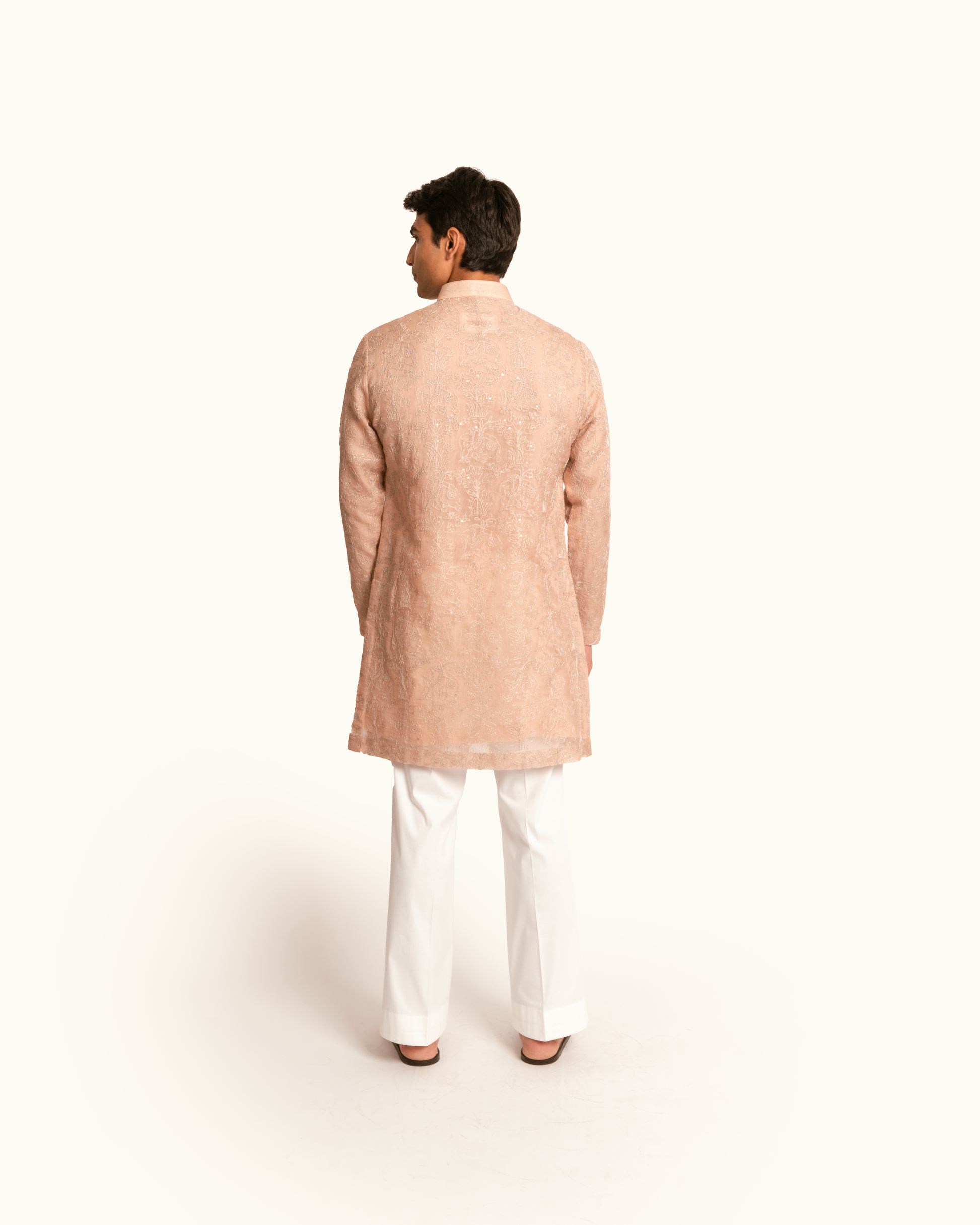 This Peach Organza Elephant Motif Kurta Set offers the discerning gentleman a delightful blend of traditional charm and contemporary design, perfect for adding a touch of playful sophistication to any occasion.